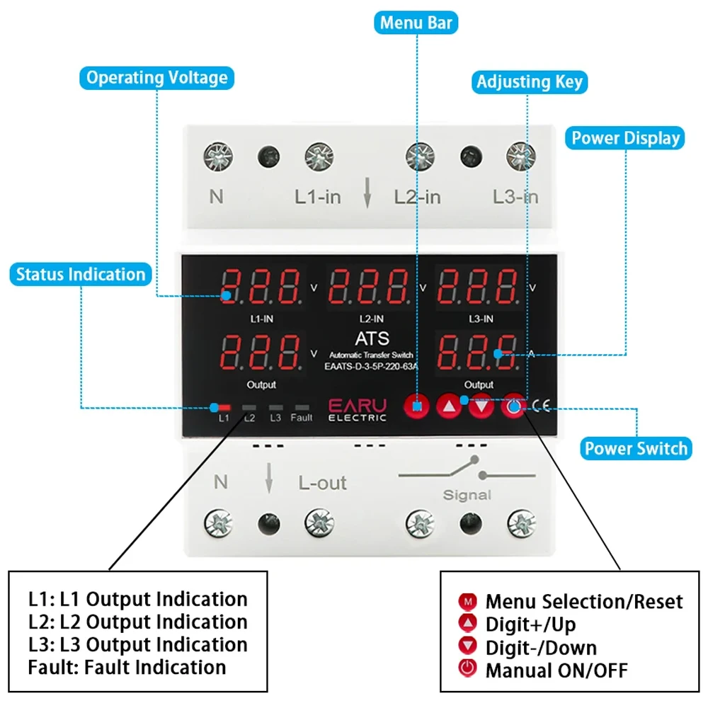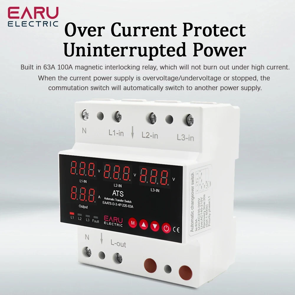 Benefit from advanced technology with Earu EAATS-D-4-4P-220-100A ATS automatic transfer switch. This device seamlessly switches power sources, ensuring continuous power supply. The phase selector adds versatility to your setup, while the uninterruptible power feature ensures your operations run smoothly no matter what.
